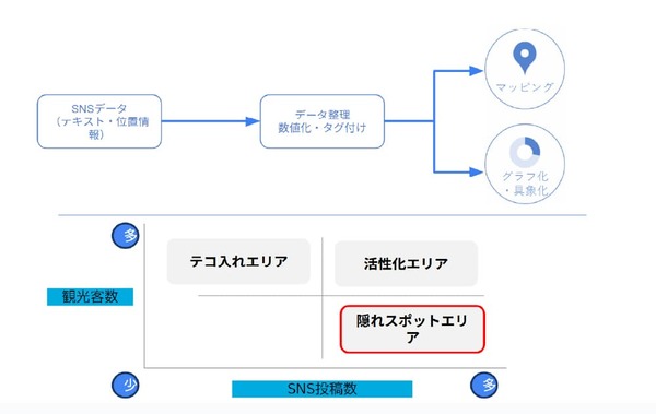 チームは、この状況を改善するためにSNSデータの活用を考案。位置情報やハッシュタグといった投稿データを整理・数値化することで、隠れた観光スポットを掘り起こし、訪問者を誘導できるのではないかというものだ。