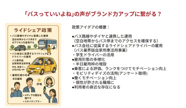 まず、ドライバー不足への対応として、学生を活用してバス会社に従属するライドシェアドライバーの不足を補うという案を提示。