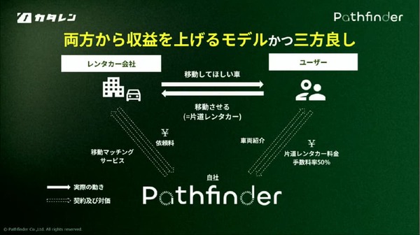 Pathfinder株式会社は、「車両配置の最適化を通じ、移動のハードルを下げる」を掲げ、片道レンタカーサービス「カタレン」を展開している。従来の片道レンタカーは返却コストが高く、通常1泊2日で1万円程度のレンタルに対して乗り捨ては約4万円と割高で、利用は全体の1割にとどまっていた。「カタレン」は、返却が必要な車両を「戻りたい方向に移動する利用者」とマッチングし、アウトレット感覚で安価に提供する仕組みだ。これにより稼働率が向上し、車両台数を最大3割削減する効果もあるという。