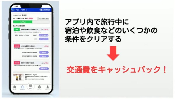 仕組みはシンプル。旅行者が現地で宿泊や飲食など一定の条件を満たすと、移動距離に応じた交通費がアプリ内でキャッシュバックされる。交通費は一人当たりの旅行支出全体の約2割に過ぎず、残りの約8割が旅行先に落ちているという。旅行先の自治体や宿泊施設、飲食店などが交通費を負担しても、それ以上の投資効果が期待できるわけだ。