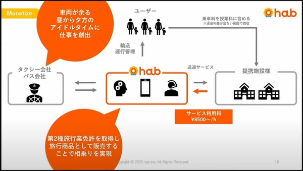 一方、スイミングスクールやプログラミング教室といった習い事を提供する施設側はドライバー不足に悩まされている。同社はこうした両者の課題を解決するため、法人向けに送迎サービスを提供。導入までに必要な工程をワンストップで支援し、第2種旅行業免許を活用してサービスを展開している。
