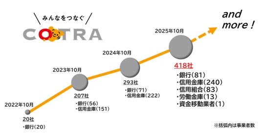 おかげさまで『ことら送金』はサービス開始から3年を迎え、累計送金金額はまもなく2兆円を突破する見込みです。2022年10月11日に20社でスタートした『ことら送金』は、現在418社にて送金手数料無料でご利用いただけます。