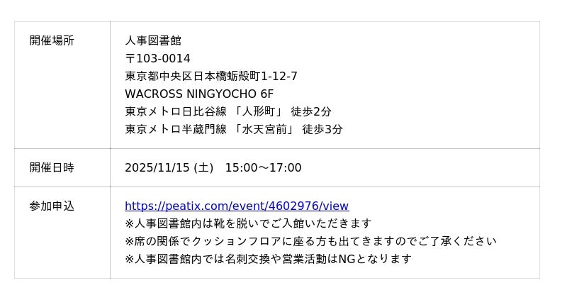 株式会社Trustyyle(本社:東京都中央区・代表取締役:吉田洋介)は、運営するコミュニティ「人事図書館」にて、2025年11月15日(土)に対面イベント「人材育成インターンシップ(効果測定編)~2時間で研修企画を体験する~」を開催いたします。