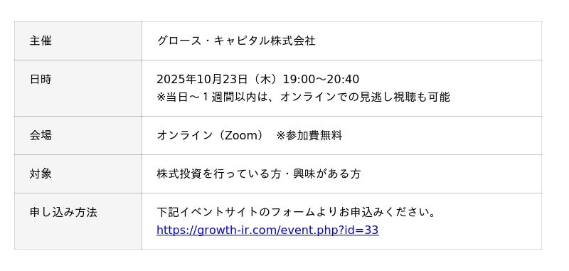 株式会社AVILEN(本社:東京都中央区、代表取締役:高橋 光太郎、以下「AVILEN」)は、2025年10月23日(木)に、グロース・キャピタル株式会社が主催する、個人投資家向けオンラインIRイベント「Growth IR Seminar」に登壇することをお知らせいたします。
