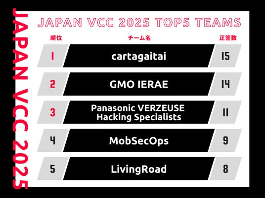 激戦の末、「Global VCC 2025」日本参加者上位入賞者チームの「cartagaitai」が見事1位に輝きました。第2位は「GMO IERAE」、第3位には自動車関連業界チームとして参加の「Panasonic VERZEUSE Hacking Specialists」が入賞しました。