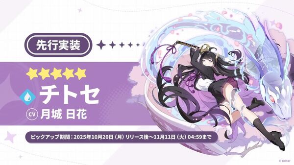 そして、限定ピックアップとして★5キャラ「チトセ(CV:月城日花さん)」が実装決定。「目のやり場に困る」「これはエッッッ」「透明感出てきた…」「覚悟はいいか、俺はできてる」などユーザーからは良反応で、じつにYostarらしいキャラでユーザーの心をわしづかみにした形だ。