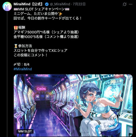 今後は、スロットの結果をAIキャラクターと連動させる企画や、SNS連動イベントも予定しています。『MM SLOT』を通じて、より多くのユーザーが「MiraiMind」で遊び、創造力を広げていただけるように取り組んでまいります。
