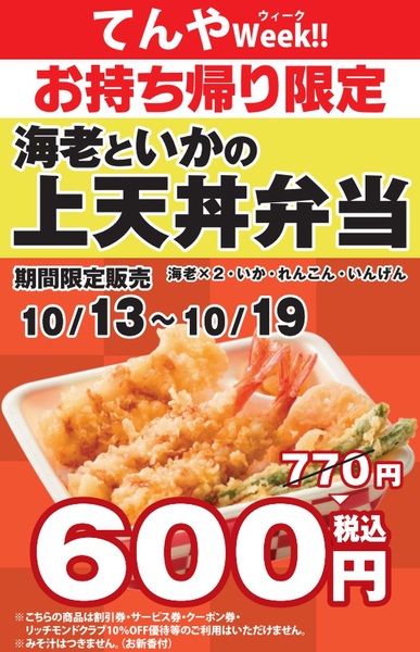 てんやの毎月恒例の持ち帰りキャンペーンで、期間中、持ち帰りの「海老といかの上天丼弁当」が通常価格770円のところ特別価格600円で販売されます。