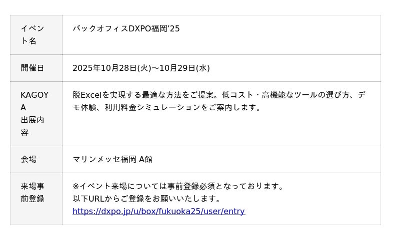 カゴヤ・ジャパン株式会社(本社:京都府京都市、代表取締役社長:岡村 武、以下KAGOYA)は、2025年10月28日(火)~10月29日(水)にマリンメッセ福岡で開催される「バックオフィスDXPO福岡’25」に出展いたします。