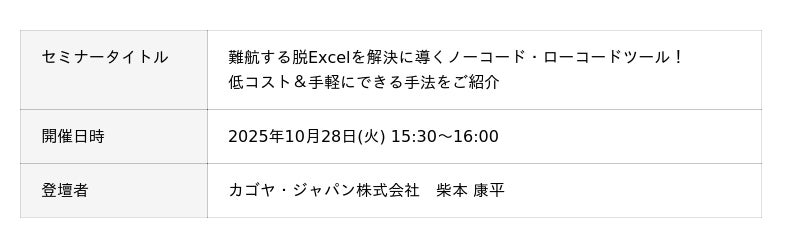 多くの企業で課題として挙げられることが多い「脱Excel」。無制限に開発予算を投入できる状況であれば解決策は数多く存在しますが、現実的には様々な制約があります。本セミナーでは、多くの企業が抱える『脱Excel』の課題に対し、低予算かつ誰でも手軽に実現できるノーコード・ローコードツールのベストプラクティスをご紹介します。「バックオフィスDXPO福岡’25」にご来場の際は、この機会にぜひご参加ください。