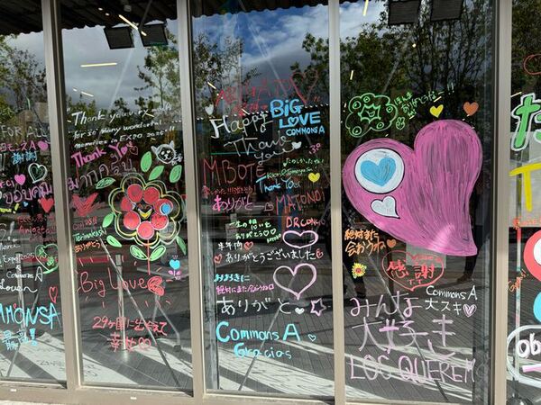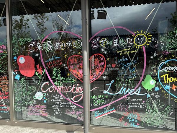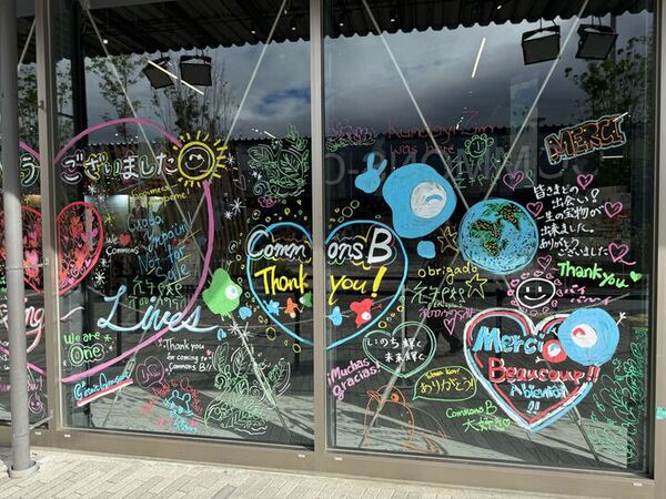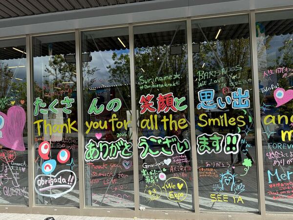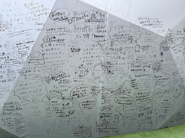 コモンズA、コモンズBや電力館パビリオンなどのパビリオンは外壁やガラス部分にスタッフや来場者からのメッセージが多数。