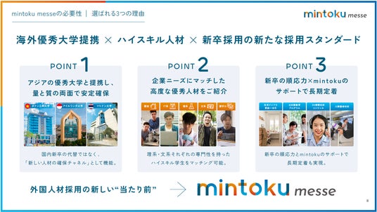 大学新卒ハイスキル外国人材と日本企業を結ぶ採用・定着支援サービス『mintoku messe(ミントクメッセ)』を開始