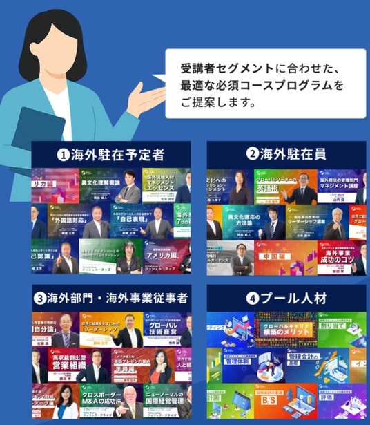 INSIGHT ACADEMY Eラーニングでは豊富な講座を組み合わせることで、海外経験の有無、就労国、役職、職種など、受講者のポジションやキャリアパス、立場によって異なるグローバル人材育成上の課題に対して、個別に対応することが可能です。