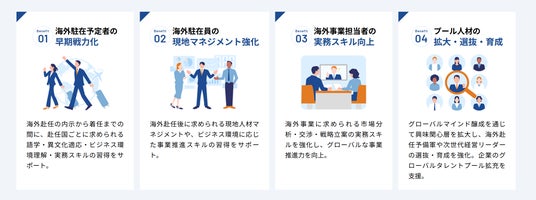 8000名の海外実戦経験豊富な専門家と1,000社以上の海外事業支援で培った「活きた知見」を集約し、グローバル人材を「海外で収益を生み出せる人材」と定義。