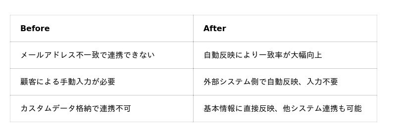 - 顧客入力依存による取得漏れ一部の連携先では、顧客自身がメールアドレスを手動で入力する必要があり、入力率が低下していた。