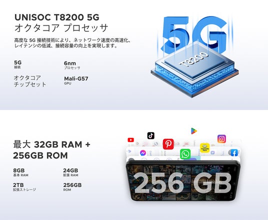 UNISOC T820(オクタコア、最大 2.3GHz、6nm プロセス)搭載。