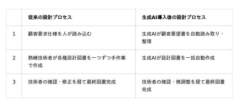従来は熟練技術者が2~3週間かけて手作業で作っていた設計図書を、AIがわずか数時間~数日で最終修正・確認作業で完成するレベルまで自動作成します。これは手書きをタイピングに変えるような劇的な変化で、設計期間の短縮が期待されます。