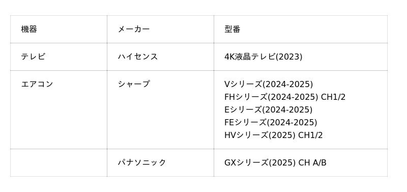 今回のアップデートでは、エアコン、テレビの対応機種が追加されました。スマート家電リモコンの対応機器は、今後も随時増えてまいります。