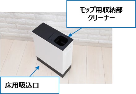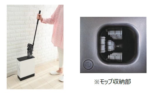 従来のモップ収納ケースを不要にし、モノを減らして省スペース化を実現したモップクリーナーです。収納ケースとモップをキレイにするクリーナー機能を一体化することで、リビングなどの生活空間にもすっきりと置け、いつでも気軽に掃除ができる環境を整えます。収納部には、使用後のモップを手軽に清掃できる「吸引口」と「かきとりブラシ」を搭載し、モップを収納する際に付着したゴミやホコリを効率よく除去でき、掃除後の手間を軽減します。また、床用吸込口では、モップで集めた小さなゴミやホコリを吸わせることができます。