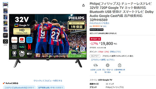 Philips(フィリップス)から、32V型のチューナーレステレビ「32PHH6569」がAmazonタイムセールに登場しました。