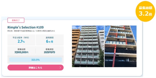 プロパティエージェントの展開する不動産クラウドファンディングRimple’s Selection#109募集総額323.5%の1.22億円の応募