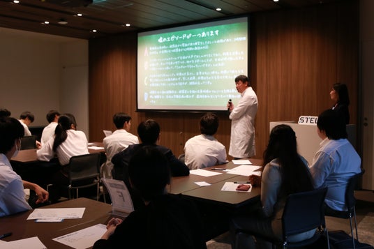 最初にSOLIZE Holdingsの宮藤康聡(代表取締役社長CEO)とSTELAQの三宅香代子(代表取締役社長)から学生に向けて、メッセージを送りました。宮藤は「勇気ある挑戦と無謀な挑戦は違う。ちゃんと準備をして意思を持った勇気ある挑戦をグループとしては歓迎するし、みなさんに期待している」と内定者への期待を伝え、三宅は「失敗は未来からみると失敗でなく、挑戦した時点でそれが必ず未来につながる」と挑戦のリスクを恐れる必要はない、と学生に話しました。