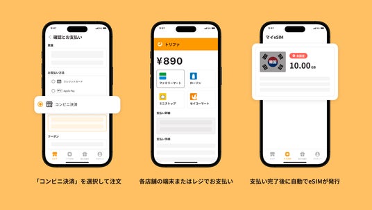 - 利用方法:アプリで「コンビニ決済」を選択して注文 → 各店舗の端末またはレジでお支払い → 支払い完了後に自動でeSIMが発行