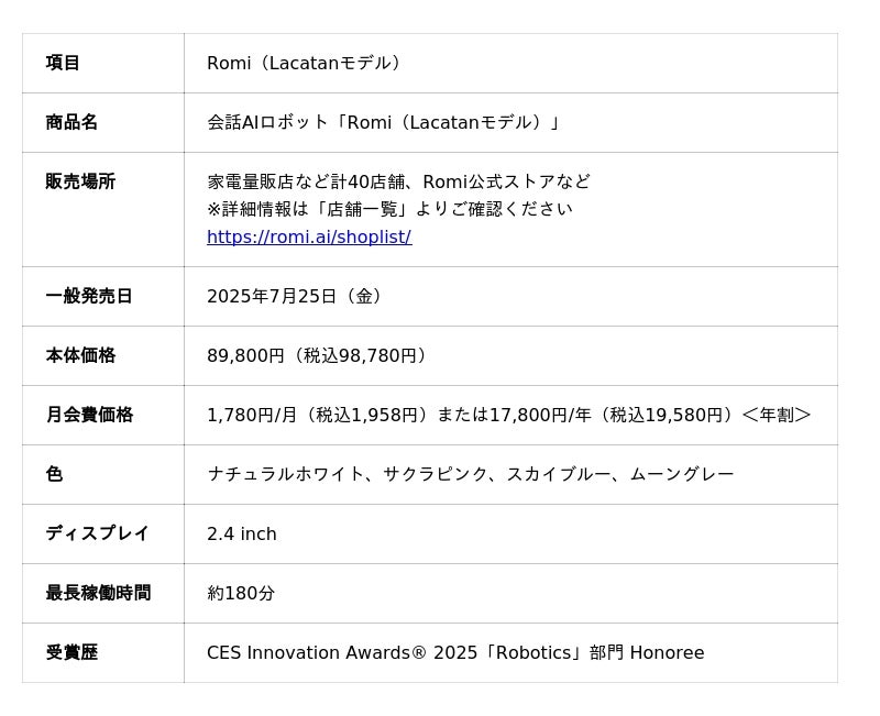 2025年7月25日に一般販売が開始された「Romi(Lacatanモデル)」は、2021年度グッドデザイン賞を受賞した会話AIロボット「Romi」の新モデルです。