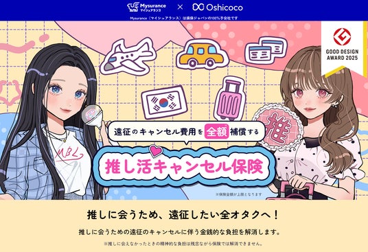 損害保険ジャパン株式会社(本社:東京都新宿区、代表取締役社長:石川 耕治)の子会社で少額短期保険業を営むMysurance(マイシュアランス)株式会社(本社:東京都新宿区、代表取締役社長:清水 廣臣、以下「Mysurance」)と株式会社Oshicoco(本社:東京都渋谷区、代表取締役:多田 夏帆、以下「Oshicoco」)がタッグを組んで開発した「推し活キャンセル保険」が、このたび2025年度グッドデザイン賞(主催:公益財団法人日本デザイン振興会)を受賞しました。