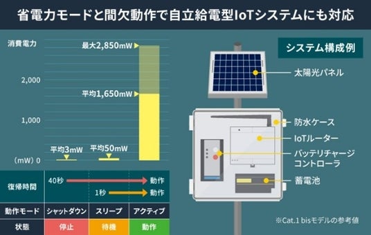 「シャットダウンモード」と「スリープモード」を搭載しています。予め設定された時間やSMS受信で起動することができ、これらのモードを使い分けることで間欠動作を実現し、IoTルーターの消費電力を抑えることができます。ソーラーパネルとバッテリを組み合わせた自立給電型のIoTシステムとして利用可能で、屋外にも設置できる動作温度範囲(-20℃~+60℃)をカバーします。