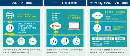 - クラウドI/Oマネージャー機能クラウドI/Oマネージャー機能を搭載しており、IoTルーター本体を開発することなく、AWSやMicrosoft Azureといったクラウドサービスと連携し、RS-485や接点入出力デバイスの監視や制御を実行できます。これにより、実用的なIoTソリューションを少ない工数で実現します。