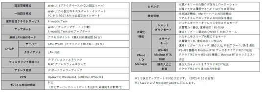 デバイス運用管理クラウドサービス「Armadillo Twin」に対応しています。クラウドからIoTルーターの稼働監視ができるほか、デバイス再起動やソフトウェアアップデートも可能です。遠隔地に設置したIoTルーターも常に最新の状態に保てます。