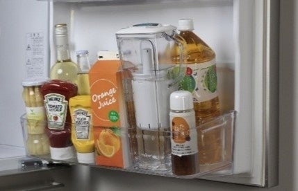 冷蔵庫のドアポケットの前列・後列はもちろん、小型冷蔵庫のドアポケットにもすっきり収まる、スぺパ(スペースパフォーマンス)に優れたデザインを採用。