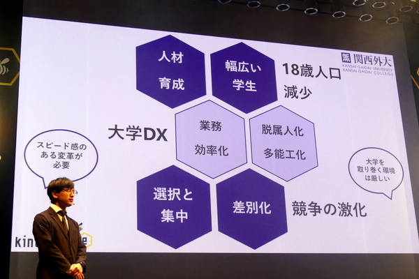 現在、関西外国語大学では全職員の約6割強にあたる13部署115名がkintoneを利用している。そんな関西外国語大学の二人が、今回のkintone hive登壇で成し遂げたいのは、「他大学のkintoneユーザーの仲間を増やしたい、つながりたい」ということだ。「なぜこんな目標を掲げたのか?」と、山本氏は大学を取り巻く現状について説明する。