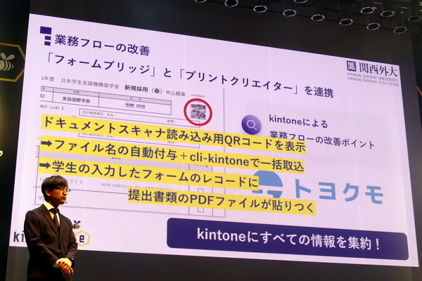 申請の部分ではkintone+フォームブリッジ(トヨクモ)で非対面・ペーパーレス化を実現した。ただ、奨学金の申請においては、紙の書類がどうしても必要になる。日本学生支援機構に提出する書類がそれだ。そのため、フォームブリッジとプリントクリエイターを連携させ、学生が提出する書類にQRコードを印刷し、提出書類のPDFをkintoneに一括取り込みできるようにした。「無理をして紙をなくすのではなく、紙をいかに効率よく管理していくか? この視点でkintoneにすべての情報を集約することに成功しました」と山本氏は振り返る。