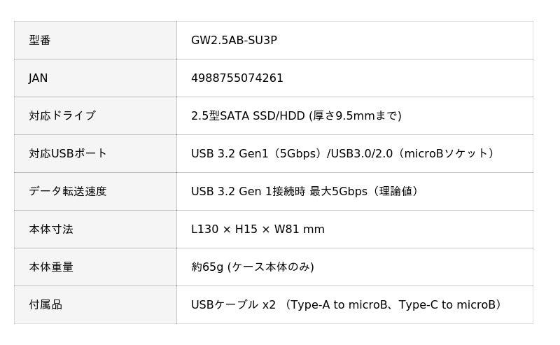 GW2.5AB-SU3P | 玄人志向 USB3.2 Gen1 接続 2.5型 SATA SSD/HDDケース