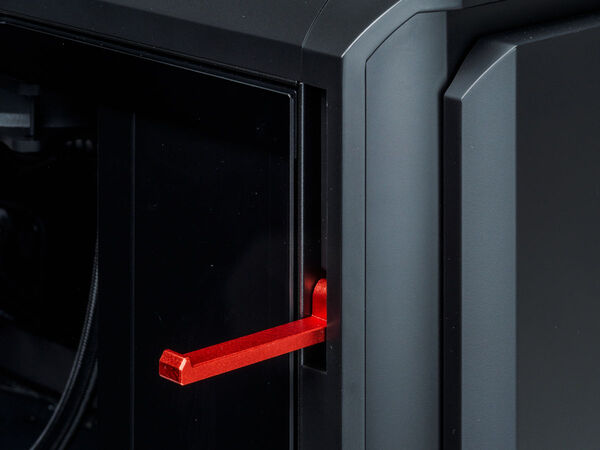 そのガラスサイドパネルの右上には、赤い格納式のヘッドホンホルダーも搭載されている。ゲームや配信などでヘッドホンやヘッドセットを使用する際、その置き場所に困ることがあるが、これなら必要なときにホルダーを取り出して掛けておくことができて便利。ホルダーの長さはおよそ5cmあり、かなり頑丈なため、大型のヘッドホンでも安心して使えそうだ。