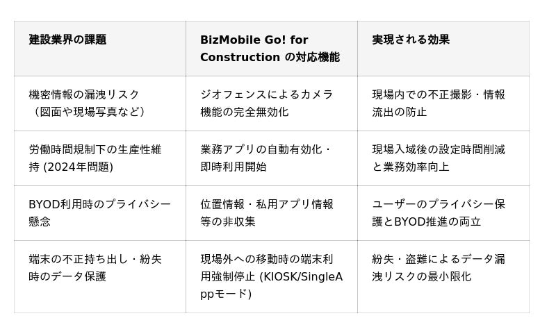 本ソリューションは、建設業界が抱えるセキュリティ、生産性、プライバシーの複合的な課題に対して、以下の通り解決策を提供します。