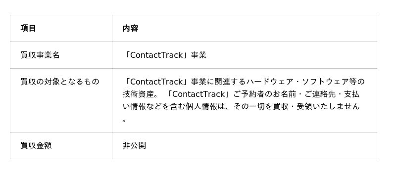 本事業買収に先立ち、Diver-X株式会社に対し「ContactTrack」の予約金を既にお支払いいただいたお客さまにつきましては、Diver-X株式会社よりその全額を返金いたしますことを、ご予約者様個別にご連絡済みでございます。返金に関するご質問は、Diver-X株式会社のお問い合わせフォーム(https://diver-x.jp/contact/)よりお問い合わせください。