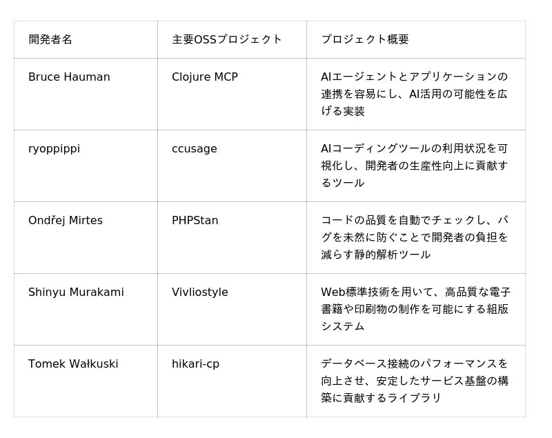 ビジネス向けクラウドサービスを提供するトヨクモ株式会社(本社:東京都品川区、代表取締役社長:山本 裕次)は、オープンソースソフトウェア(OSS)開発者を支援するプログラム「Thanks OSS Award」において、2025年度下期(7月~12月)の支援対象者を決定したことをお知らせします。2022年の開始から7回目となる本活動により、累計支援総額は$251,227(約3,700万円 ※1)に達しました。当社は、現代のデジタル社会を支えるOSSエコシステムの持続可能性に貢献するため、年間1,000万円規模の支援を今後も継続してまいります。