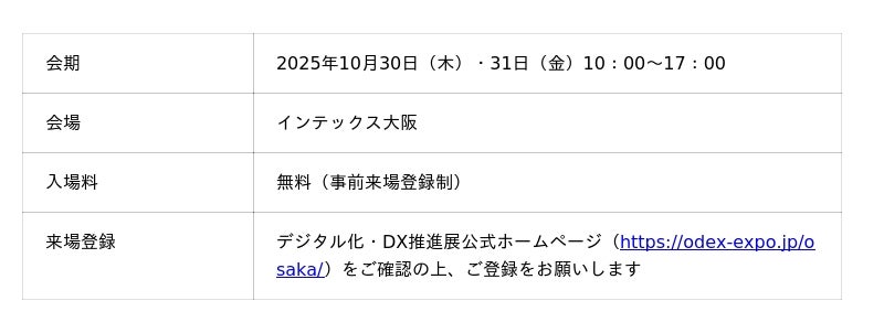 JCOM株式会社(J:COM、本社:東京都千代田区、代表取締役社長:岩木 陽一)は、2025年10月30日(木)・31日(金)に開催される「第5回 デジタル化・DX推進展(ODEX) 大阪会場」(主催:デジタル化・DX推進展 実行委員会、後援:総務省、厚生労働省、経済産業省、国土交通省、デジタル庁)に出展いたします。