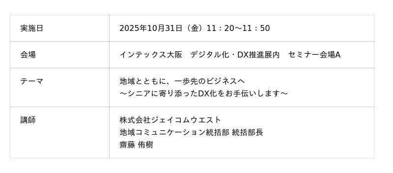 また、会場では「地域とともに、一歩先のビジネスへ ~シニアに寄り添ったDX化をお手伝いします~」と題した講演をおこないます。本講演では地域活性化起業人として大阪府千早赤阪村に派遣した J:COM社員が住民や役場職員と共に村のDX化に取り組んできた事例をご紹介します。