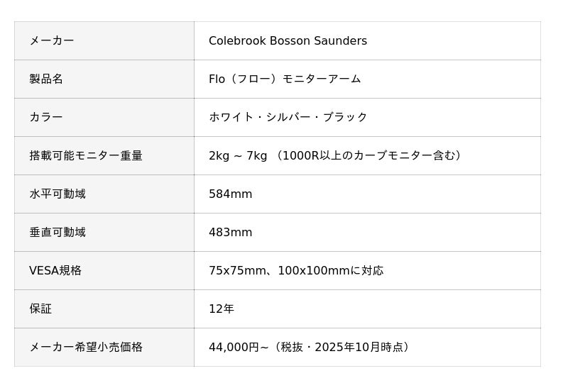 エルゴノミクスに基づいたイギリスのITアクセサリメーカーであるColebrook Bosson Saunders(以下「CBS」と称する)は、今年3月に発売を開始した「Flo(フロー)モニターアーム」において、2025年度グッドデザイン賞を受賞致しました。