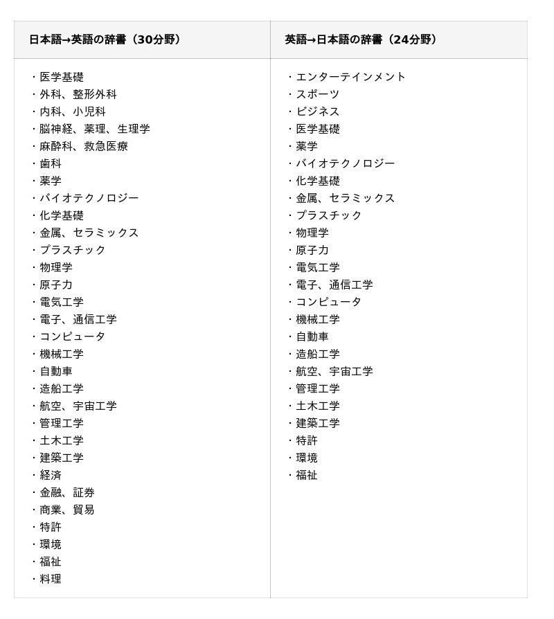 日本語から英語は30分野15万語、英語から日本語は24分野51万語を収録しています。これにより、専門用語が多用される会議の議事録や、技術資料や学術論文などの翻訳精度が大幅に向上します。