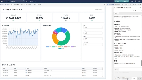 生成AIとの対話を通じて、インタラクティブにダッシュボードや業務アプリケーションを生成する「AIウィジェット」機能を実装する。価格は6万円/10ユーザー(税別)からとなり、生成AI機能は設定された上限までは追加費用なしで利用可能だ。
