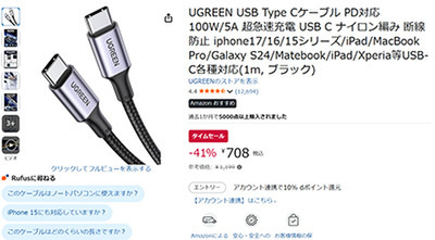 スマホアクセサリーブランド「UGREEN(ユーグリーン)」の「UGREEN USB Type Cケーブル PD対応 100W」が現在、Amazonタイムセールで41%オフの708円という特別価格で販売中です。