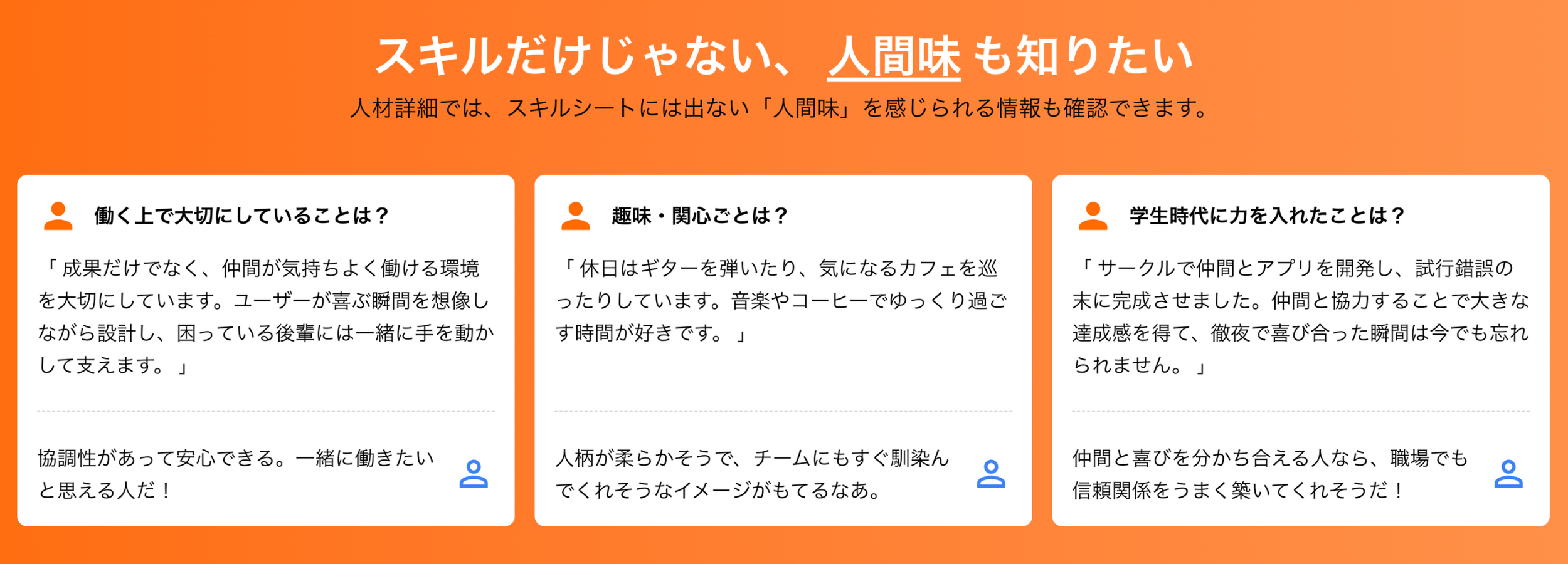 Skill Links では「働く上で大切にしていること」「趣味や関心ごと」「学生時代に力を入れたこと」など、スキルシートだけでは見えない情報も事前に知ることができます。