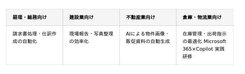 さらに、AIを活用できる人材を育成するための法人向け「生成AI研修」も提供中。ChatGPTやGeminiなどの生成AIを業務で活用する方法を、業界・業種に合わせた実践形式で学べる内容となっています。