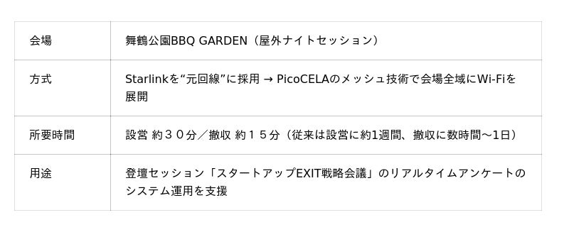 Starlinkを元回線に、PicoCELAメッシュ技術で会場内全域にWi-Fiエリアを提供