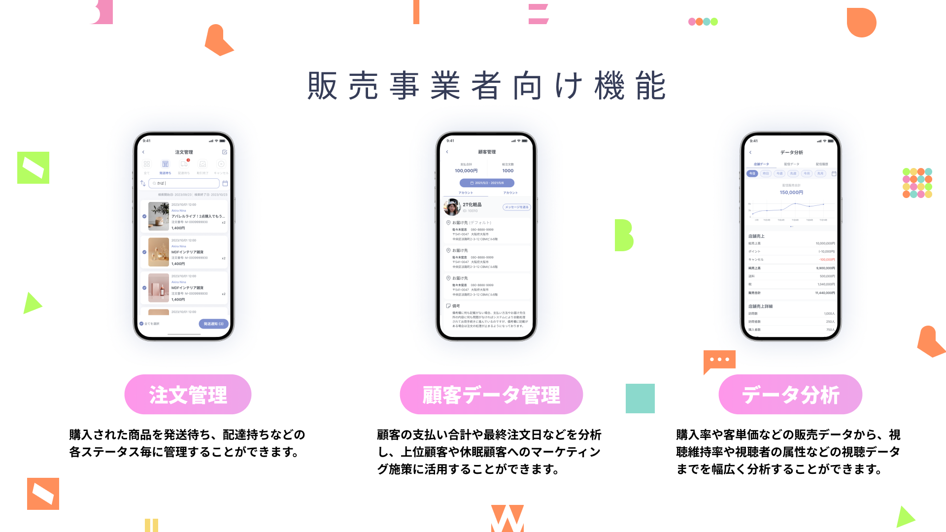 また、販売事業者は注文状況や顧客データの管理からデータ分析までを、「WABE」上で完結することができます。